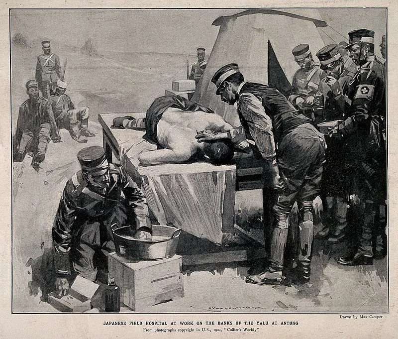 A man being treated on a table in an open-air Japanese field hospital (Halftone after M. Cowper, 1904) © public domain via Wikimedia Commons